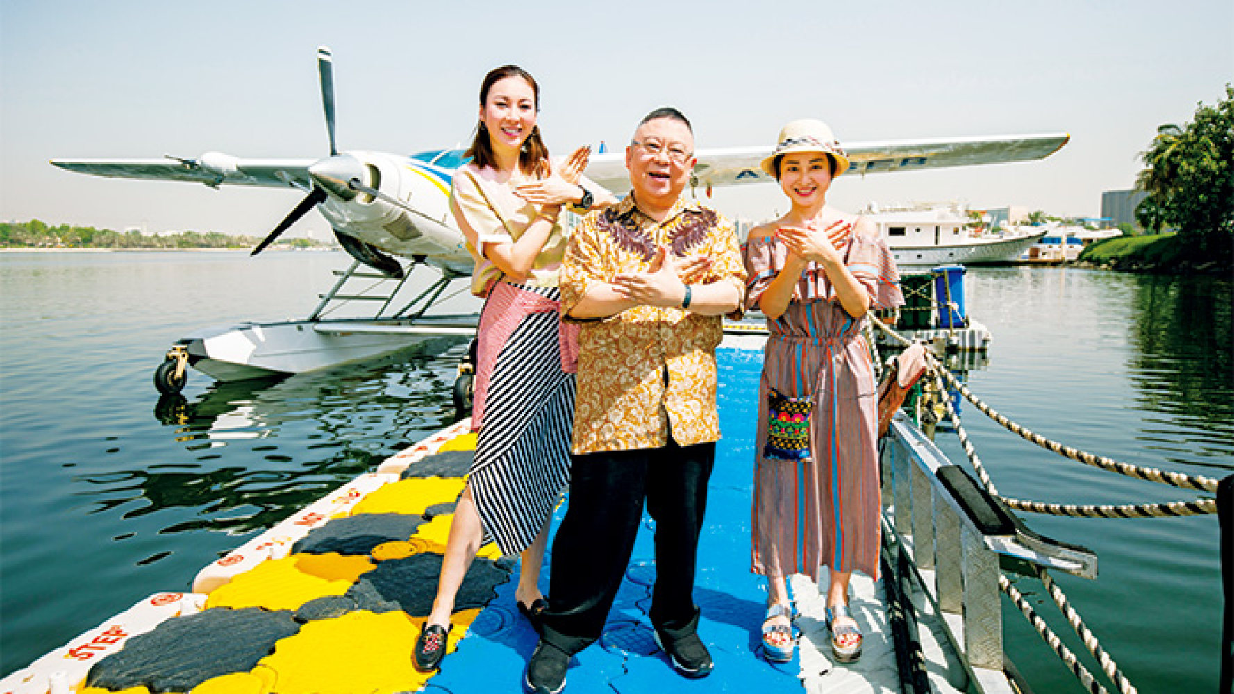 多年前,我在杜拜拍攝《致富者聯盟》,向莊鍶敏(左)和林寄韻傳授孔雀明王手印,學習如何振翅高飛,不要被瘟疫綑縛住心靈的自由。